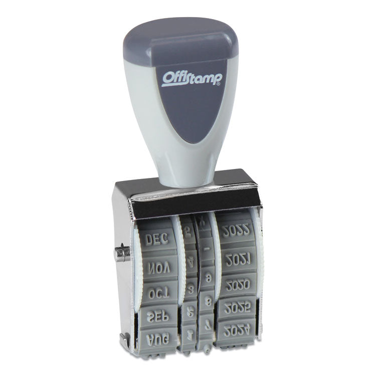 Save time—stamp rather than write the date on your important documents. Easy-to-rotate month, day and year wheels make it easy to get everything just right each and every day. Round, ergonomic plastic handle allows you to get a comfortable grip. Durable steel frame. Stamp Type: Dater; Ink Types: Conventional; Number of Lines: 1; Impression Width: 1".