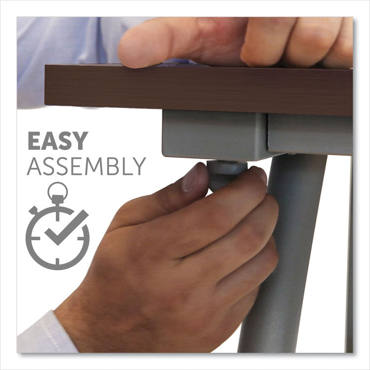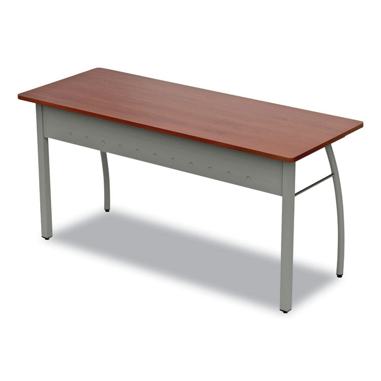 Scratch- and stain-resistant woodgrain laminate with durable edge and strong powder coated steel frame. Adjustable leveling glides for stability. Quick and easy assembly in minutes with no tools required. Configure multiple desks to perfectly fit your space. Includes metal modesty panels. Pedestals fit under desk. Series Name: Linea Italia® Trento Line; Worksurface/Base Color: Cherry; Color Family: Cherry; Worksurface Shape: Rectangular.