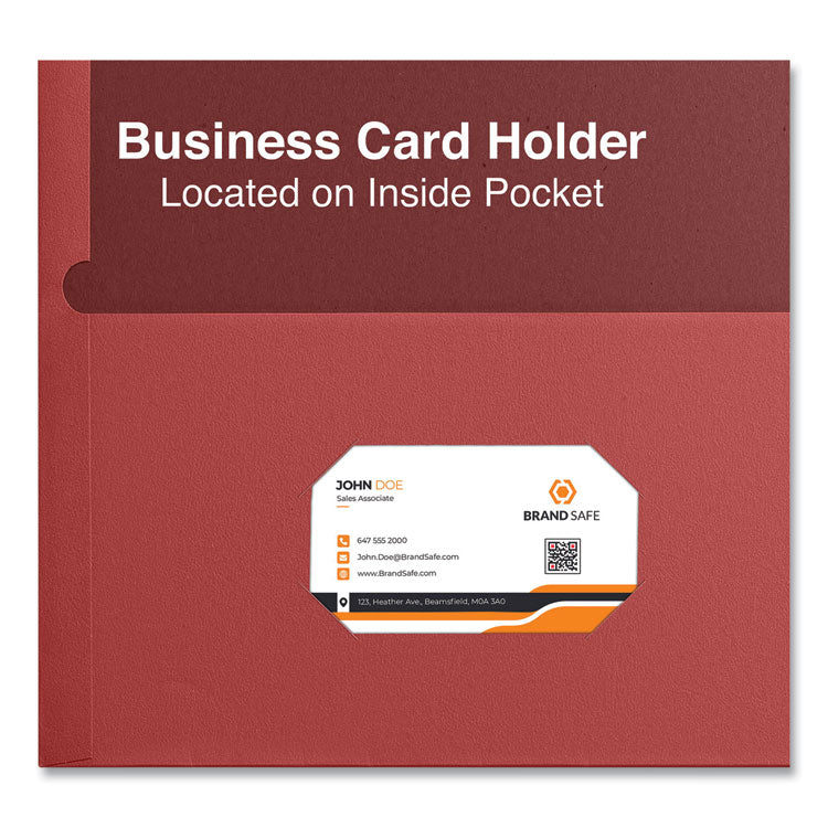 The perfect presentation piece, a sturdy, two-pocket, textured folder for holding documents, brochures, sales flyers, and proposals. The portfolio texture adds a nice touch to an economical portfolio. Constructed with built-in, die-cuts on left pocket to keep your business card in view for follow-up. Great as a leave-behind folder for literature or proposal. Holds 8.5" x 11" paper sheets and a 3.5" x 2" business card. Front Cover Color(s): Red; Color Family: Red; Back Cover Color(s): Red; Sheet Size: 11 x 8.5.
