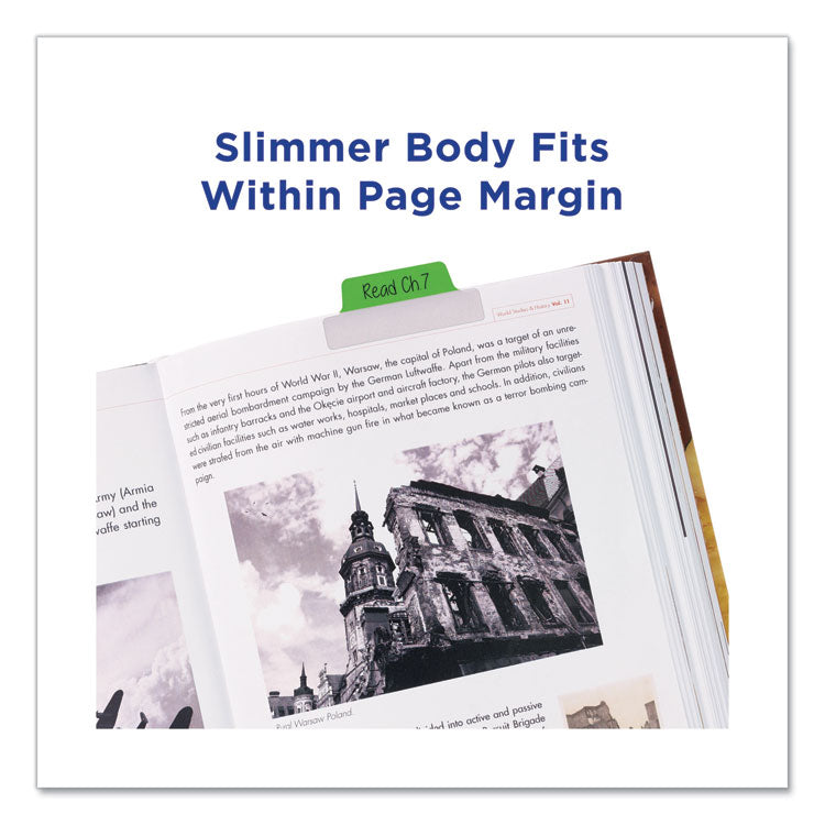 Sturdy, self-adhesive repositionable tabs that make indexing, marking, referencing and separating documents quick and easy. Writable on both sides of the tab, and the adhesive body is clear so you can see text underneath. Durable enough to turn pages like a divider, and they stick securely but remove cleanly with no residue. Ideal to use for organizing and marking key information in notebooks, files, books, planners and more. Perfect for home, office and school. Margin Tabs—Wide, slim-body, 2.5" x 1" tabs fit on the margins of pages without obscuring text. File Insert/Tab Type: All-Purpose Tabs; Tab Cut: 1/5-Cut; Color(s): Assorted; Color Family: Multicolor.