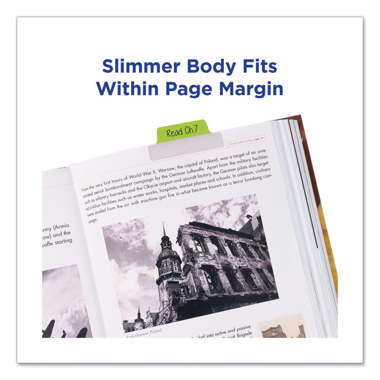 Sturdy, self-adhesive repositionable tabs that make indexing, marking, referencing and separating documents quick and easy. Writable on both sides of the tab, and the adhesive body is clear so you can see text underneath. Durable enough to turn pages like a divider, and they stick securely but remove cleanly with no residue. Ideal to use for organizing and marking key information in notebooks, files, books, planners and more. Perfect for home, office and school. Margin TabsWide, slim-body, 2.5" x 1" tabs fit on the margins of pages without obscuring text. File Insert/Tab Type: All-Purpose Tabs; Tab Cut: 1/5-Cut; Color(s): Assorted Neon; Color Family: Multicolor.