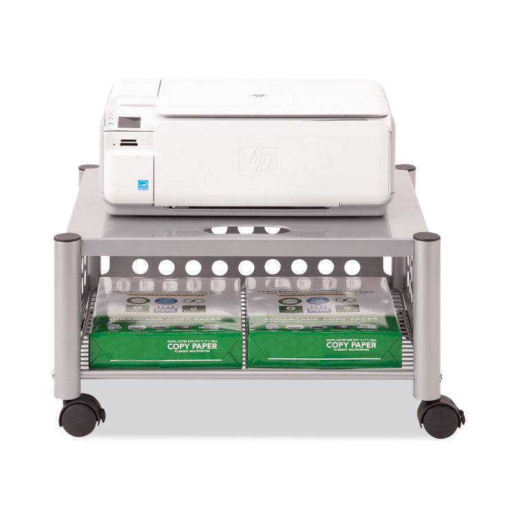 Versatile machine stands are ideal for printers, fax machines, and personal copiers. Durable steel and wire construction. Four, two-wheel casters; two locking. Easy to assemble. Features two convenient openings to route cords/cables and to use as a handle to pull from beneath worksurface. Material(s): Metal Wire; Steel; Overall Material Type: Metal; Color(s): Matte Gray; Color Family: Gray.
