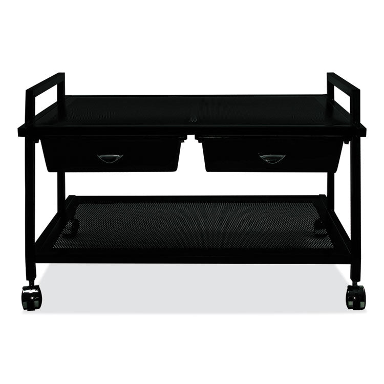 With durable steel construction, the Vertiflex® Underdesk Machine Stand is sturdy enough to hold a printer, fax machine or personal copier. Two drawers are conveniently located below the top shelf and can store printer supplies, specialty paper and more. The machine stand's compact size fits under most workspaces and is easy to assemble. Easily rolls on four twin-wheel casters (two locking). Material(s): Steel; Color(s): Black; Color Family: Black; Overall Width: 25.3".