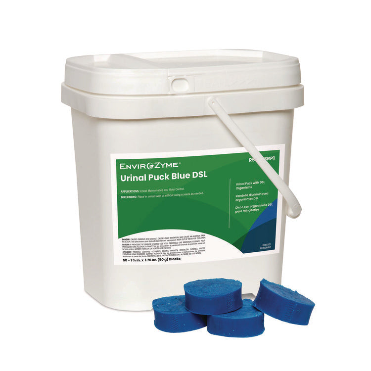 Urinal Puck Blue DSL is comprised of bacterial cultures capable of degrading uric acid which is the leading cause of scaling and odors in urinals. Because these urinal pucks degrade odors naturally, this urinal puck is cost-efficient, saving money by reducing the frequency of urinal flushing. Urinal Puck Blue DSL has the added benefit of dispensing bacteria and water softening agents into the drains with each use and flush. Deodorizer Type: Urinal Block; Scent: Fresh; Color(s): Blue; Quantity: 50/Pack.