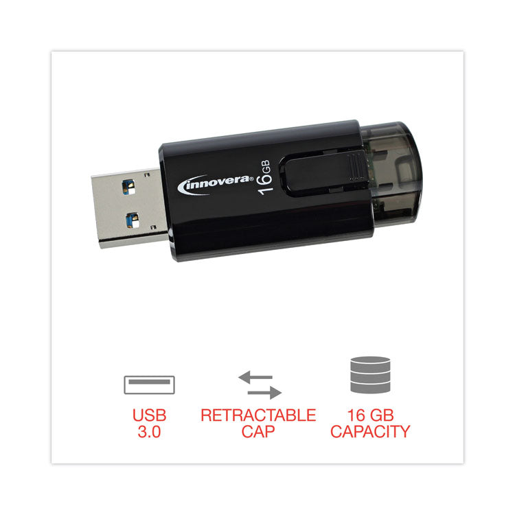 Innovera® USB 3.0 Flash Drive is an ultra-fast drive with a no-loss, retractable cap. USB flash drives are a convenient and secure way to move and store your digital files. Simple plug-and-play design. Great for sharing photos, presentations, files and documents. Great on-the-go flash drives that are perfect for packing in a laptop bag, briefcase, purse, or backpack for easy transfer of files from one computer to another. Compatible with all standard USB ports. Connector/Port/Interface: USB 3.0; Storage Capacity: 16 GB; Drive Write Speed: 20 MBps; Reading Speed: 20 MBps.