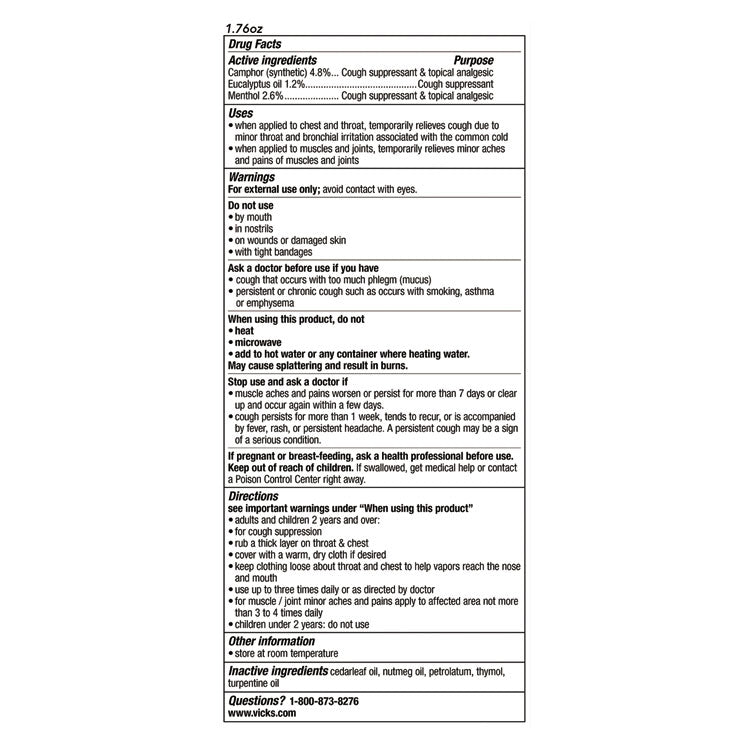 Kiss your cough goodbye, with a topical cough medicine with medicated vapors. It starts working quickly for to relieve cough symptoms. Appropriate for ages two and up, topical VapoRub® is a comforting choice for sick children. Not likely to cause drowsiness or jittery side effects when used as directed. Because it is a topical cough medicine, it may be appropriate for diabetics looking for an alternative to oral cough medicines that contain sugar. Contains: Camphor (Synthetic) 4.8%; Eucalyptus Oil 1.2%; Menthol 2.6%; Description: 1.76 oz (50 g) Jar; Quantity: 36/Carton.