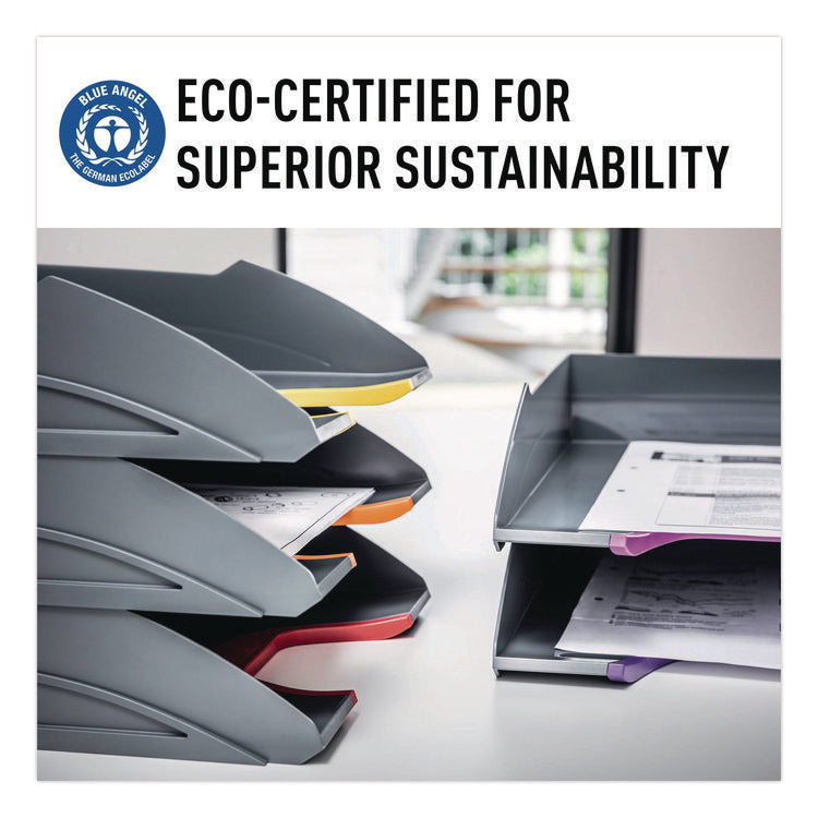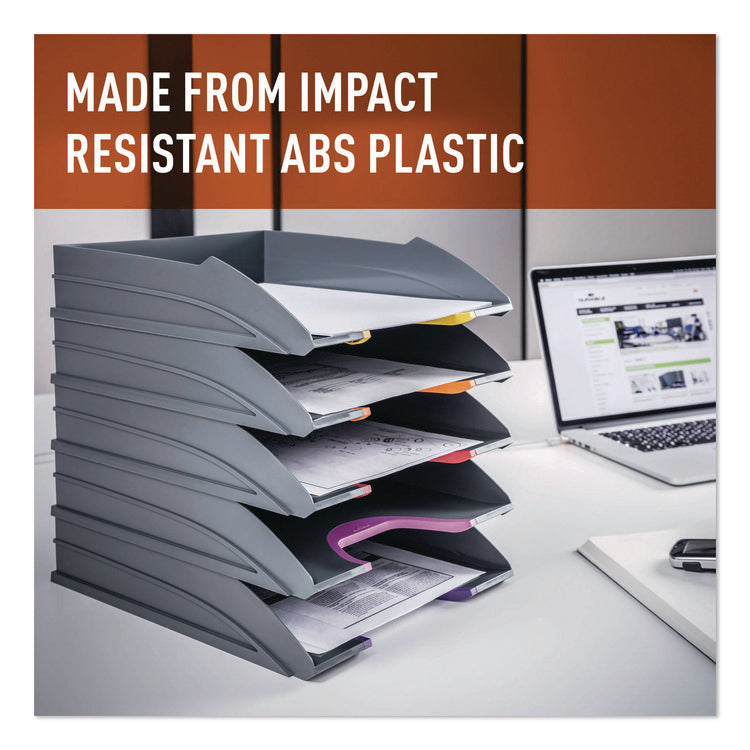 The VARICOLOR® Stackable Letter Tray Set from DURABLE® is a versatile storage solution that streamlines your organization and productivity. The five color-coded trays keep all your essential documents neatly organized, whether it's paperwork, files, mail, brochures, notepads, important documents and more. Maintaining a clutter-free workspace is effortless – simply place it directly on your desktop to ensure essential paperwork is always within reach. For those seeking even greater space optimization, stack multiple units together – they can be stacked either vertically or staggered. Alternatively, seamlessly integrate them into standard office storage cabinets, sideboards, and bookcases for a streamlined and organized workspace. Crafted with premium, long-lasting plastic, VARICOLOR is designed to stand the test of time, making it the perfect solution for high-traffic environments where document handling is frequent. This VARICOLOR Stackable Letter Tray Set is Blue Angel certified. Awarded by the German government, Blue Angel certification ensures that this item meets rigorous criteria for sustainability, health, and performance. By choosing this product, you're supporting responsible manufacturing practices. Each tray has a colorful cut out so you can easily locate and grasp your files. The anti-slip base pads provide stability and protection, preventing slips and desktop scratches. VARICOLOR is the perfect solution for a wide range of environments, ideal for organizing documents in offices, schools, restaurants, hotel front desks, retail stores, banks, hospitals, maintenance offices, legal offices, senior living homes, warehouses, manufacturing, industrial settings, and even at home. Number of Compartments: 5; For File Size: Letter to Folio; Load Orientation: Front; Color(s): Anthracite Gray.