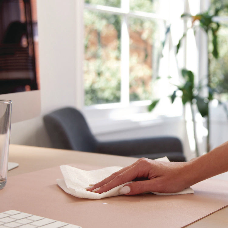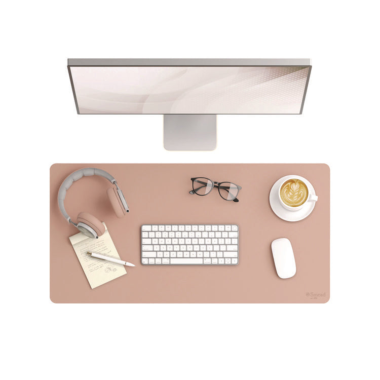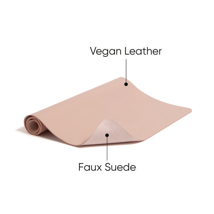 Instantly upgrade your workspace with the Vegan Leather Desk Pad. Crafted with a blend of vegan leather and faux suede, this desk pad exudes style and substance. Its sturdy construction ensures a protective layer against scratches from keyboards and water stains. The smooth finish not only adds a touch of elegance but also provides an ideal writing surface. Place it on any desk or tabletop to upgrade your workspace instantly. This luxury-looking desk pad doubles as a reliable mouse pad, enhancing your productivity. With its durable build, this desk pad is a perfect blend of quality and functionality, making it a must-have addition to your organized and professional setup. Width: 31.5"; Depth: 15.7"; Base Color: Light Pink; Material(s): (67%) Vegan Leather (PVC); (33%) Faux Suede.