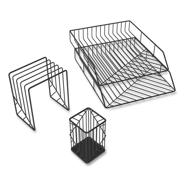 Give your office a modern look with this four piece wire metal desktop accessories set. U Brands desktop filing set is the perfect combination of fashion and function, allowing you to express your personal style while helping you get organized and declutter your work area. The desktop filing set displays a strong metal bent wire design that will complement any room decor, whether it is a traditional office or a home workspace. Desktop Supplies Organizer Type: Desktop Sorter; Number of Compartments: 8; Overall Width: 3.95" Sorter; 10" Tray; 2.75" Pencil Cup; Overall Depth: 5.15" Sorter; 12.3" Tray; 2.75" Pencil Cup.