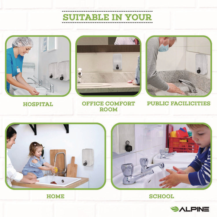 The Alpine Vertical Manual Surface-Mounted Stainless Steel Liquid Soap Dispenser combines durability and functionality. The material is both corrosion- and vandal-resistant, allowing it to stand up against harsh chemicals and multiple users without it rusting or eroding away. Works with most commercially marketed, all-purpose hand soaps, making it ideal for high traffic areas such as restrooms, break rooms, kitchens and lunchrooms. A push button with a valve makes it quick and simple to dispense of the soap, while the clear window on the front allows you to easily monitor the soap level so you can refill when necessary. Soap Dispensers Type: For Liquids; Interior Volume Capacity: 40 oz; Mounting: Wall; Material(s): Stainless Steel 304.