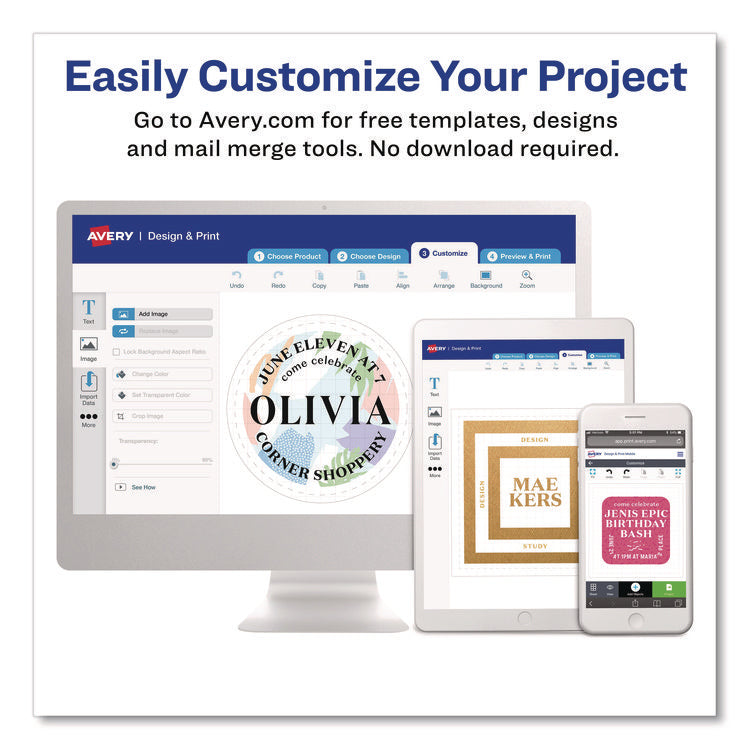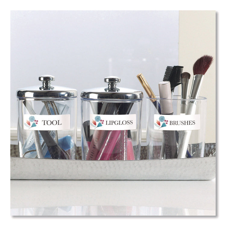 Labels can be printed with vivid color and sharp text and are ideal for special mailings, messages, invitations and announcements. Easy to customize with free templates and designs using Avery Design & Print. 8.5" x 11" sheets for color laser and inkjet printers. Color Laser Labels with Sure Feed® and Print-to-the-Edge—Designed for a reliable printer feed and printing colors to the edge of the label. Shape: Rectangular; Label Size - text: 0.75 x 2.25; Label Color(s): White; Color Family: White.