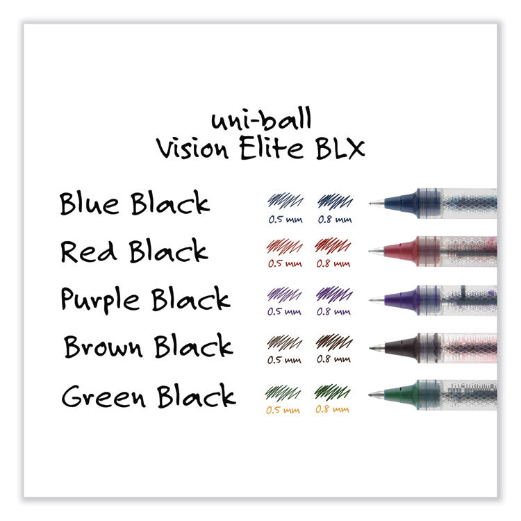 Create ideas as vividly as can be imagined with Vision Elite Rollerball Pens from uni-ball featuring a bend-resistant stainless steel tip and a tungsten carbide rollerball. Capped roller pens deliver smooth, intense lines with unparalleled definition - useful for note taking, list making, signing checks and legal documents, and even uniquely embellishing creative writing projects. Innovative uni Super Ink technology effectively entraps the gel ink into the paper, producing fraud, fade and water-resistant documents that resist check washing or bleaching. These Vision Elite pens have a special design that withstands cabin pressure variances without leaking, making them useful for travelers. Exclusive Uni-Flow Ink System ensures a consistent, delightfully fluid writing experience, and a translucent window ensures that you don't run out of ink unexpectedly. Express your signature style with the sleek, modern design and elite performance of uni-ball's Vision Elite Rollerball pen - no matter the altitude. Pen Sub-Brand & Product Family: VISION ELITE™ BLX Series; Pen Type: Hybrid Gel Pen; Pen Style: Stick; Pen Tip Type: Conical.