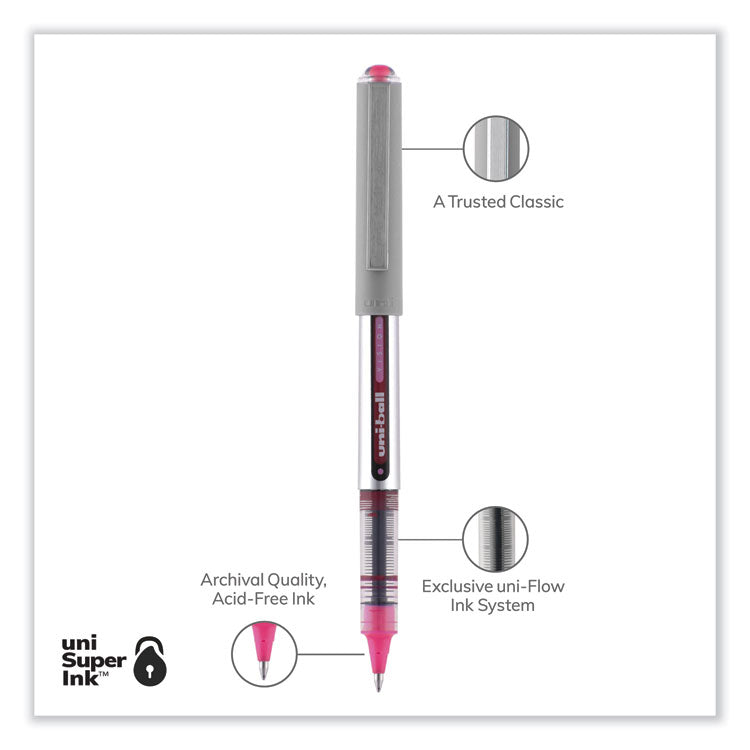Make your everyday writing easy with the effortless and dependable performance of Vision Rollerball Pens from uni-ball featuring strong, long lasting tips. Capped roller pens deliver an even liquid ink lay-down for reliably smooth, vivid lines and a rich color for improved clarity and readability. Great for all writing tasks from taking notes to record keeping with archival quality, acid free roller ink. Innovative uni Super Ink technology forms an indestructible bond with the paper to minimize the risk of check washing or document fraud, while also protecting from water and fading. The exclusive Uni-Flow Ink System ensures a consistent, delightfully fluid writing experience, and a translucent window ensures that you don't run out of ink unexpectedly. Enjoy beautiful clean lines and give all of your ideas a burst of brilliant color with this classic style rollerball pen. Pen Sub-Brand & Product Family: VISION; Pen Type: Rollerball Pen; Pen Style: Stick; Pen Tip Type: Conical.