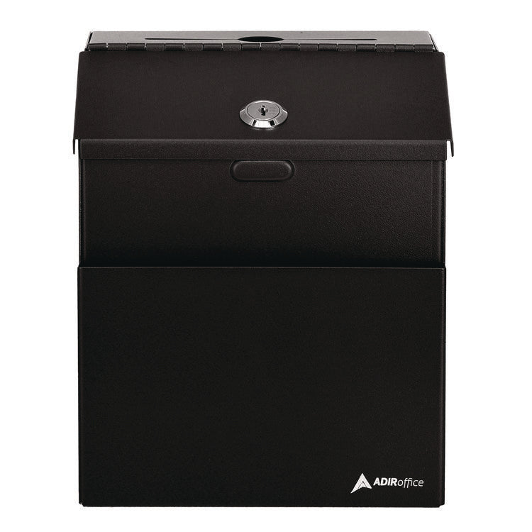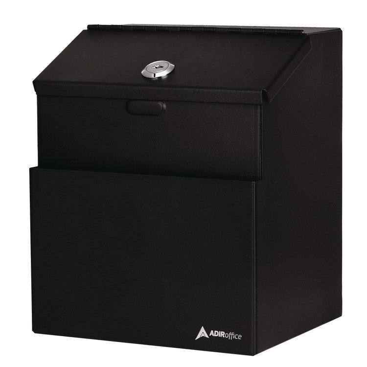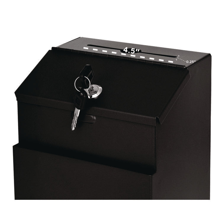 Encourage reliable interaction with clients or employees with this lockable steel suggestion box. The lock ensures confidentiality, which inspires your customers and staff to share their opinions and comments honestly. Compact and lightweight, the box can be placed in any easy-to-reach spot or mounted on a wall to save space. Two keys are included with this purchase for quick and easy access inside. The deposit slot is 4.75" length x 0.13" width, making it ideal for dropping off payments, interoffice mail or suggestion cards. Additionally, the opening in the middle is large enough to drop off keys. A front pocket is ideal for holding pens, suggestion cards and small envelopes, allowing for writing suggestions and comments right on the spot. Stick-on labels that dedicate the box for suggestions, comments or for dropping off keys, as well as 25 suggestion cards are also included with this purchase. Color(s): Black; Width: 7"; Height: 8.5"; Depth: 6".