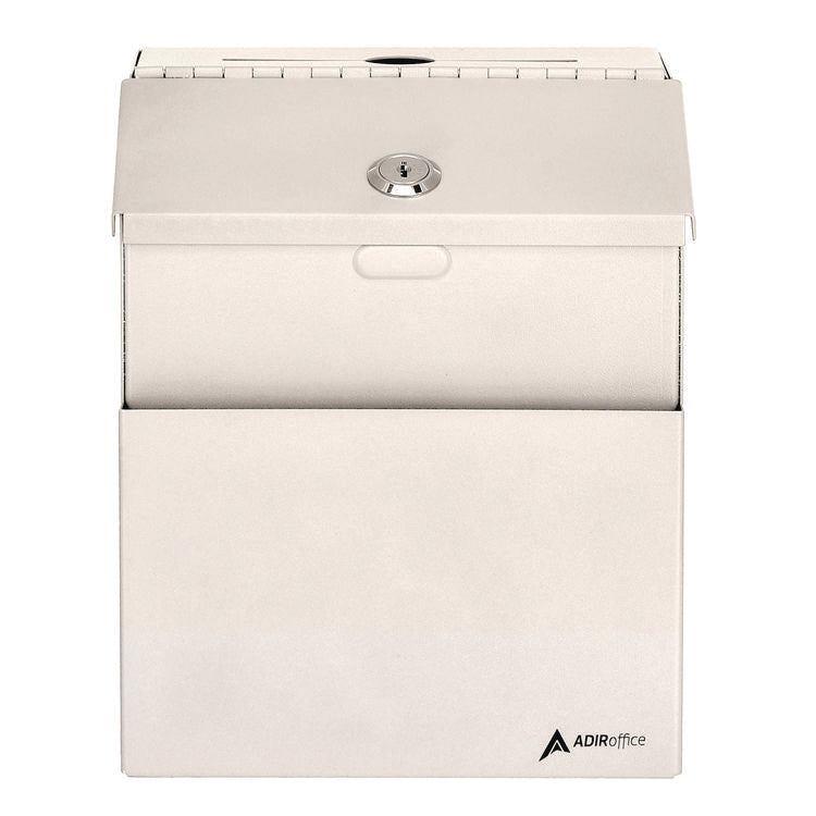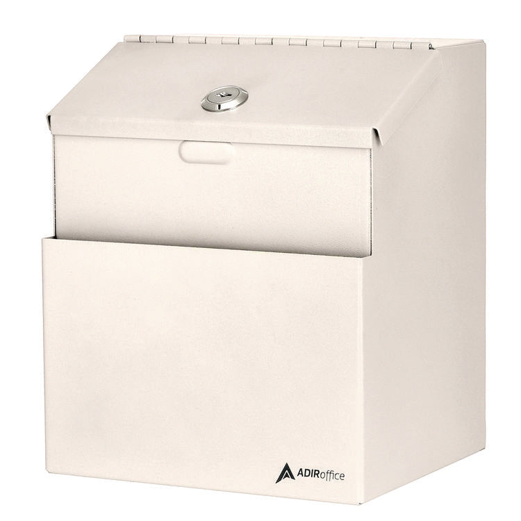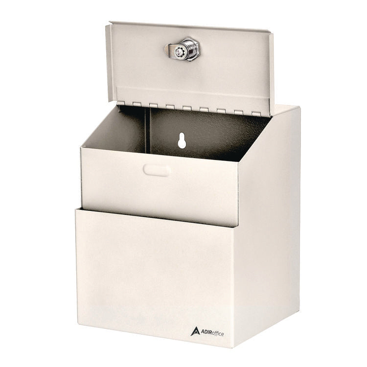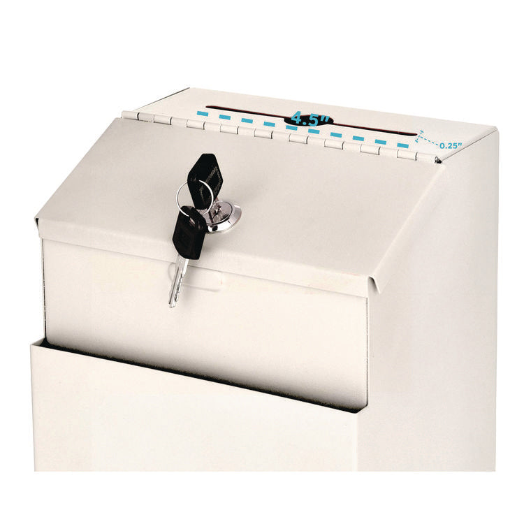 Encourage reliable interaction with clients or employees with this lockable steel suggestion box. The lock ensures confidentiality, which inspires your customers and staff to share their opinions and comments honestly. Compact and lightweight, the box can be placed in any easy-to-reach spot or mounted on a wall to save space. Two keys are included with this purchase for quick and easy access inside. The deposit slot is 4.75" length x 0.13" width, making it ideal for dropping off payments, interoffice mail or suggestion cards. Additionally, the opening in the middle is large enough to drop off keys. A front pocket is ideal for holding pens, suggestion cards and small envelopes, allowing for writing suggestions and comments right on the spot. Stick-on labels that dedicate the box for suggestions, comments or for dropping off keys, as well as 25 suggestion cards are also included with this purchase. Color(s): White; Width: 7"; Height: 8.5"; Depth: 6".