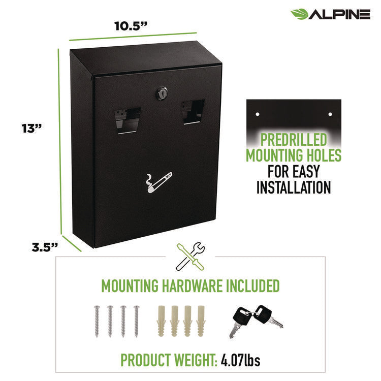 The all-in-one Alpine Industries Wall-Mounted Safe Cigarette Disposal Station is the perfect solution to reducing litter in public areas and at entrances to smoke-free facilities. Constructed of weather- and fire-resistant steel with two extinguishing screens to help avoid the unpleasant odor of smoldering smokes. Easy access to clean the storage receptacle with lock and key. You can quickly install this cigarette disposal urn onto any exterior flat surface with the supplied hardware. When full, you can easily access and clean the storage receptacle via the lock. This interior bin can be simply removed and emptied, making content removal quicker, cleaner and more efficient. Built to last, the Alpine Disposal Station is durably made using a rugged, stainless steel housing to provide long-lasting strength and use for years to come. This weather- and fire-resistant material not only holds up against everyday wear and tear, but it can also withstand harsh environmental conditions to ensure long-term durability. Place this clean-looking, wall-mounted cigarette urn at an entrance or exit to a smoke-free area or another designated smoking area to keep everyone happy. Waste Receptacle Type: Ashtray Waste Bin; Material(s): Stainless Steel; Application: Tobacco Product Waste Collection; Color(s): Black.