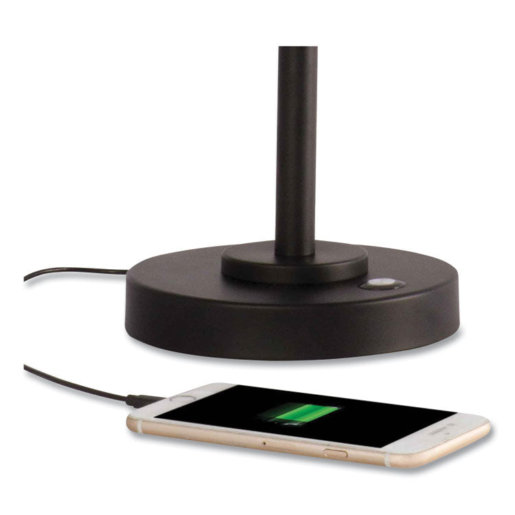 This popular classic counterbalance design just got even more beautiful with the addition of OttLite ClearSun LED technology that reduces eyestrain by up to 51%. Finished in black with antique brass accents, the Balance LED Desk Lamp is a perfect fit for any study, office, living room or bedside. And, you're in complete control with this fully customizable lamp, adjust the light angle at arm and shade, change the color temperature (ClearSun natural daylight, bright white and warm white), and select from three brightness levels. Plus, the 5 V, 2.1 A USB port lets you fully and quickly charge your devices. Base Color: Black; Plug Type: 2 Prong; Height: 4" to 18"; Width: 6".