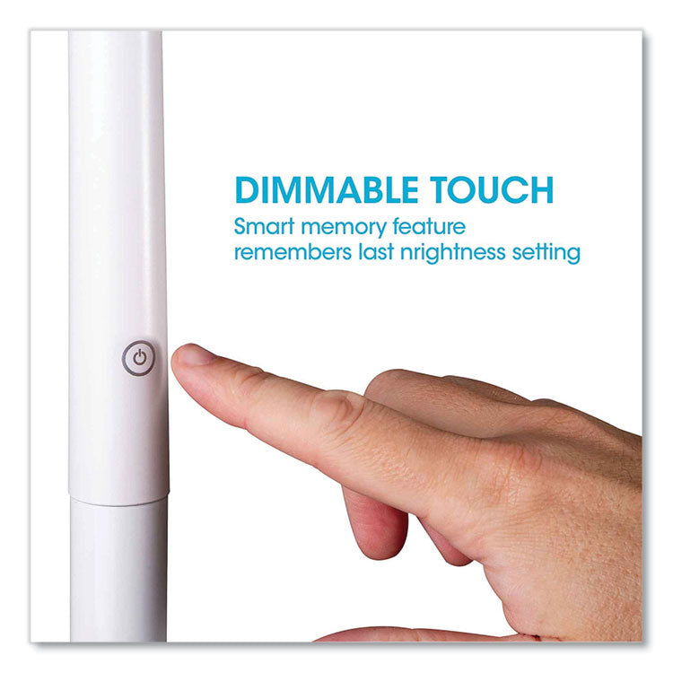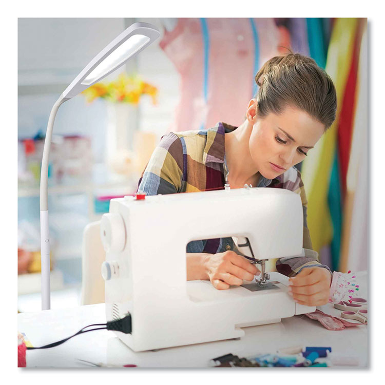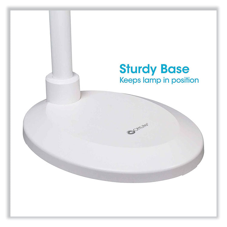 The natural daylight OttLite Flex LED Floor Lamp helps you see details clearly and colors accurately whether reading in your favorite chair or sewing in your sewing room. Exclusive ClearSun LED technology optimizes illumination while helping reduce eyestrain by 51%. With an expansive 12.5" shade and a rubberized flexible neck, you can direct the powerful OttLite ClearSun LED Illumination of this touch lamp right where you need it. With touch activated controls, you can adjust the brightness levels and the smart memory feature remembers your last brightness setting. This OttLite Flex LED Floor Lamp helps you see details clearly and reduces glare and eyestrain so you can do what you love, longer. Base Color: White; Plug Type: 2 Prong; Height: 49" to 71"; Width: 7.94".
