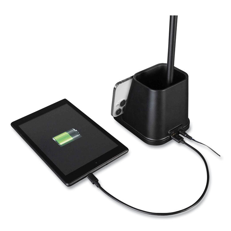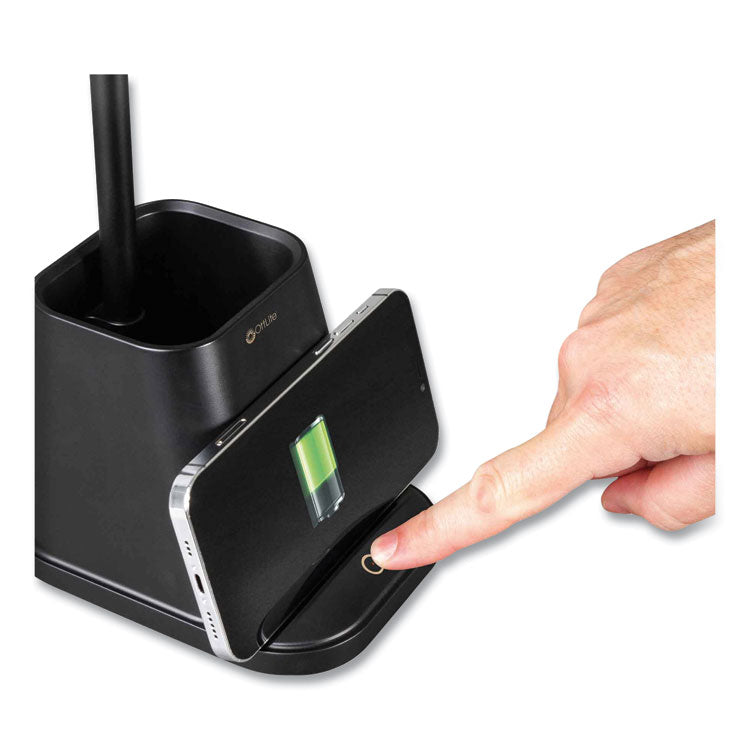 A beautiful merger of stylish organization, visual clarity and charging power, the OttLite Merge LED Desk Lamp brings mid-century modern design to a new level. Part of the OttLite Wellness Series, this feature-packed lamp helps reduce eyestrain with next generation ClearSun LED technology for crisp, clear illumination--shown to reduce eyestrain by up to 51%. Fully customizable, choose from three color temperatures (warm light, bright white and ClearSun® natural daylight), control the brightness settings and adjust the lamp shade to direct light right where you need it. Plus, charge two devices at once using the wireless charging stand for Qi-enabled devices and the 5V, 2.1A USB port for phones, tablets, earphones and more. And, keep your key supplies close by with the organization compartment. Base Color: Black; Plug Type: 2 Prong; Height: 18.25"; Width: 4.31";