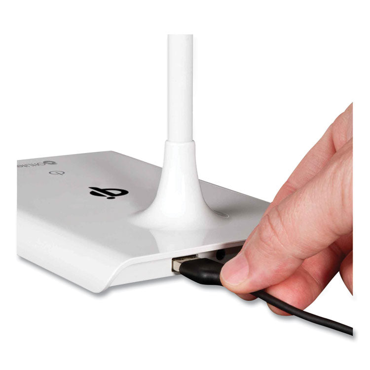 A power-packed duo—Qi-wireless charging and next generation ClearSun LED lighting. This lamp features both giving you the total convenience of wireless charging and dramatically reduced eyestrain. Three out of four people experience the discomfort of eyestrain on a daily basis. Harsh illumination, blue wavelength spikes and computer screens are often the culprit. OttLite ClearSun LEDs provide a balanced spectrum, just like the sun, to make seeing and reading easier and more comfortable. This powerful illumination is delivered in a sleek and flexible style with touch controls and dimmability to customize light levels. Charge your Qi-enabled device wirelessly on the lamp base or through the 5V, 2.1A USB port. Base Color: White; Plug Type: 2 Prong; Height: 13" to 21"; Width: 5.12".