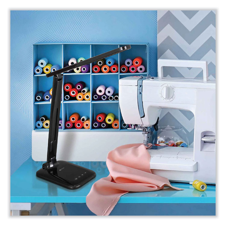 See every color and detail with ease with the OttLite Slimline LED Desk Lamp. Trusted by people who love to sew and craft, OttLite's exclusive ClearSun natural daylight LED technology has a color rendering index of 95+ so you can select and match colors with total confidence. The Slimline LED Desk Lamp also features two additional color modes—warm white and bright white. With five brightness levels, select the brightness level that works best for your space. This sleek design features two points of adjustment so you can change position as you work from a height of 20.25" to 5". Base Color: Black; Plug Type: 2 Prong; Height: 5" to 20.25"; Width: 4.75".