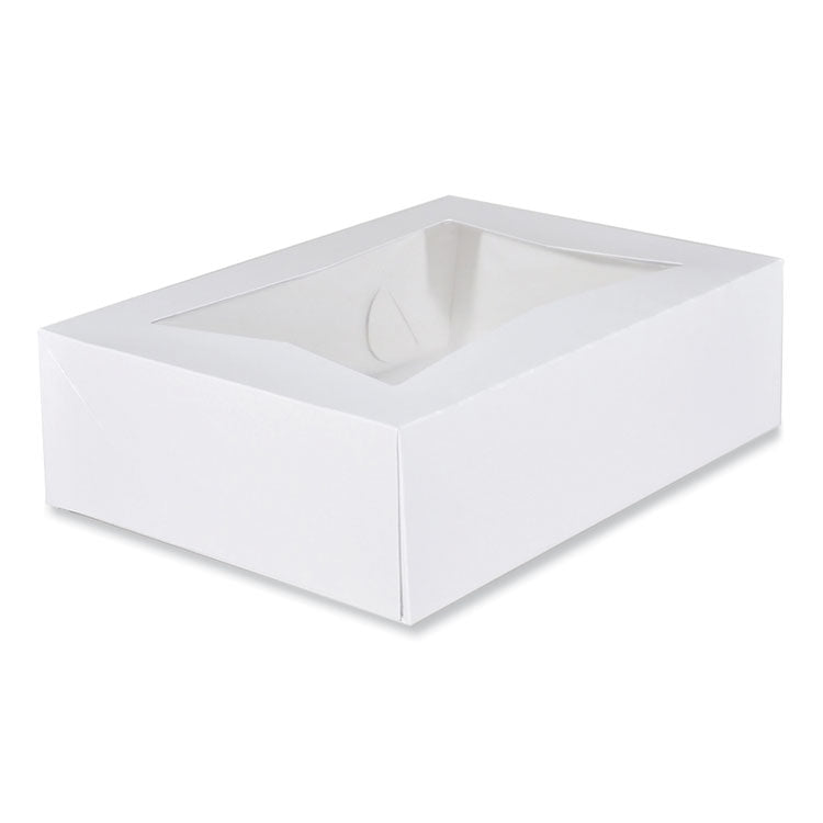 Made of SBS paperboard, which is white on the inside and outside, has an attached top, and can be used to hold and carry baked goods. White SBS (solid bleached sulfate) paperboard is thicker and more rigid than paper, is suitable for holding baked goods, and can be recycled - just be sure to remove the window film before placing in the bin. It can be printed with a logo or a business name. The attached top flips open to insert or remove baked goods. When closed, the top fully overlaps the bottom. A cellophane window provides a view of the box's contents. The box has a corner beers design with glued corners for sturdiness. Diagonal scores allow the box to be folded flat for storage or transport. 4-Corner Beers Design. Food Container Type: Box; Material(s): Paperboard; Material Type: Paper; Color(s): White.