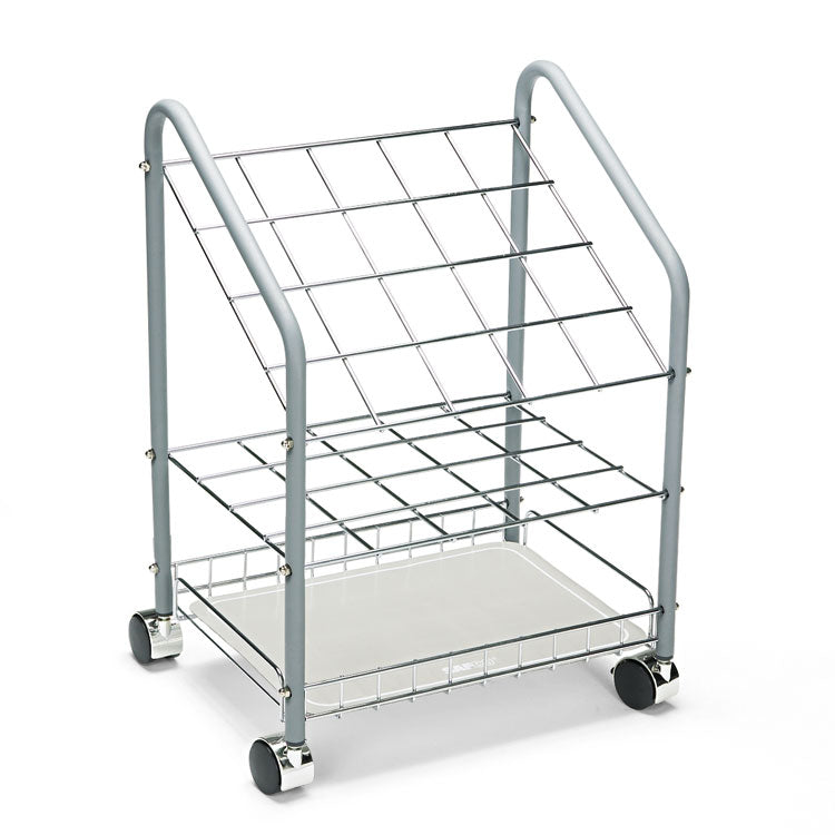 Organize your rolled up documents, plans, posters, paper, proofs, blueprints and maps into tidy rows for easier visibility and access around your home, office or classroom with the Safco Tubular Steel Wire Mobile Roll File. Slot your rolled up documents or tube-style blueprint holders into the 2.75"-square compartments to keep them organized and readily available. The Steel Mobile Roll File's tiered, grandstand-style arrangement of its compartments accommodates rolls of different lengths and helps keep them separated enough so that you can both see and access each with greater ease. Easily maneuver the Steel Mobile Roll File around your immediate workspace on its four 1.5" pivoting wheels to help keep your rolled up reference documents and materials closer to where you're actually working, so they're always within reach. Lock the two front wheels when you come to a stop for added stability while stationary. Featuring powder coated tubular steel side supports and chrome-finished steel wire grids, this Roll File ships ready to better withstand everyday use in your office, home or school and maintain its professional look for longer. And it's not just for engineering and architecture, either. Safco's Tubular Steel Wire Mobile Roll File can also help tackle the tall task of wrangling your holiday wrapping paper collection at home or putting the packing supplies in proper order in your office mailroom – even use it in the classroom to keep maps and reference charts organized and easily accessible. Color(s): Gray; Number of Compartments: 20; Compartment Size: 2.75 x 2.75; Overall Width: 18".