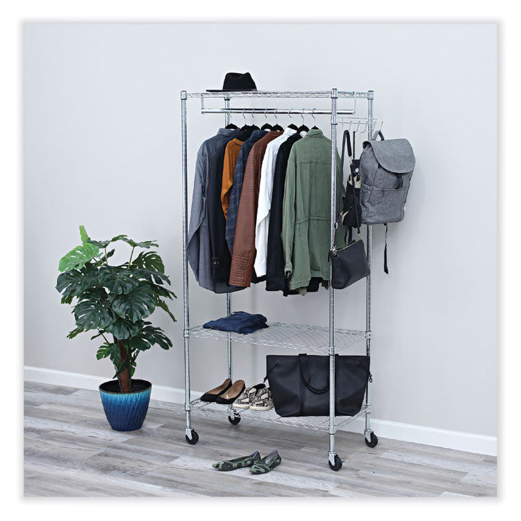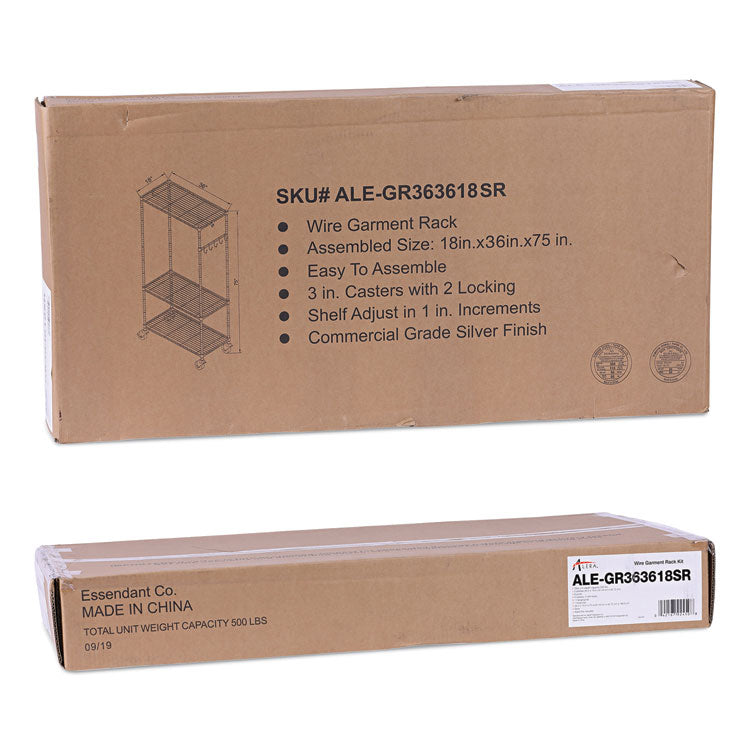 Time-saving design assembles in minutes without tools. Strong welded wire construction that allows air circulation and helps reduce dust buildup. Double-sided for quick access to items. Rack features hanging rod for garments, five support hooks for umbrellas, bags, and other items to accommodate your needs. Three shelves adjust in 1" increments and support 350 lbs. on each shelf. Four casters for quick mobility and two lock when it has reached your destination. Total unit capacity is 500 lbs. if used with casters. Hangers not included. Mounting: Stand Alone; Width: 36"; Depth: 18"; Height: 75".