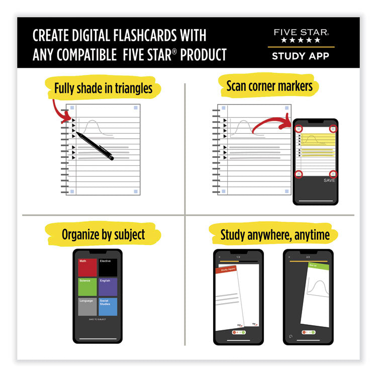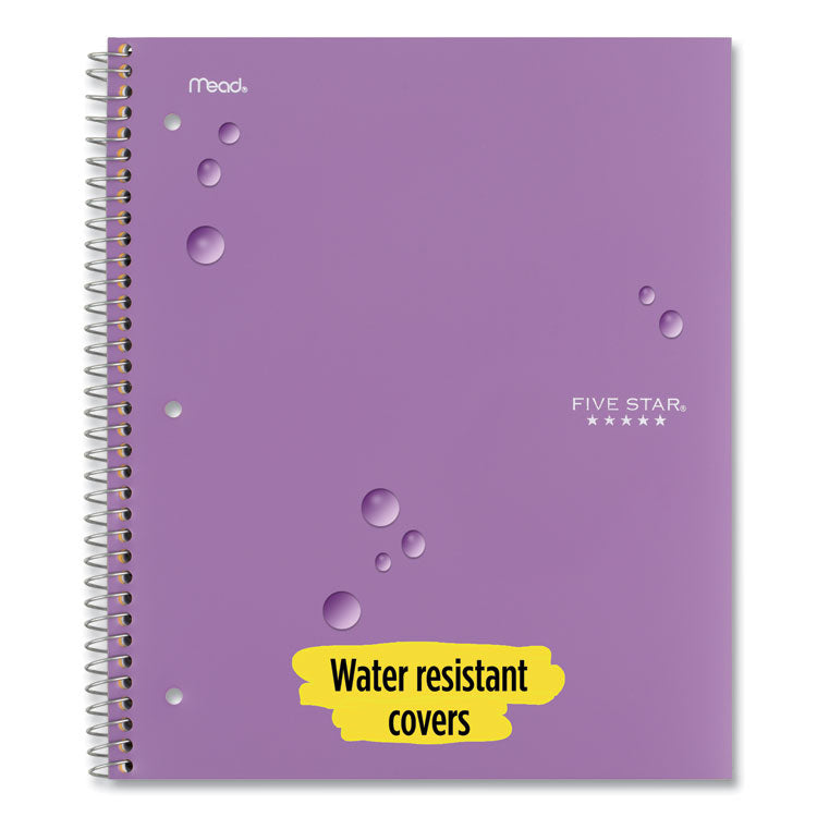 Lasts all year. Guaranteed! Durable, water-resistant poly covers protect your notes all year. Reinforced, tear-resistant divider pockets keep your loose sheets together. Spiral Lock® wire binding prevents coil snag, and high-quality paper provides excellent ink-bleed resistance. Easily inserts into any three-ring binder (sold separately). Scan, study and organize your notes with the Five Star Study App. Create instant flashcards and sync your notes to Google Drive to access them anywhere from any device. Pocket-Sized Indicator: No; Book-Binding Type: Spiral Coil; Book-Binding Details: Spiral Lock®: Flexible Cover; Book-Binding Edge: Side.
