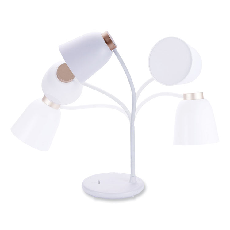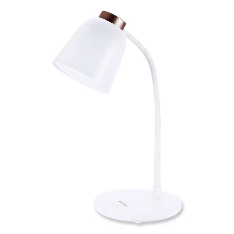 Charge your phone while you illuminate your space and work with this wireless charging desk lamp. The base doubles as a charging pad for any of your wireless electronic devices. You can charge your phone or tablet simply by setting it down on the base of this desk lamp. This white LED desk lamp also features a flexible silicone neck so you can effortlessly position the light zone to wherever you need it. The lamp mimics natural daylight to reduce eyestrain, so you can stay focused while you read, work or study. Not only can you use the timer to automatically have the light power off after 40 minutes but you can also use the touch-sensitive controls on the base to power on and off, as well as set your ideal lighting settings with the seamless dimming for optimal brightness. Sleek, simple and functional, what else could you possibly need in a desk light? It's the perfect office, home office and classroom desk accessory. Base Color: White; Plug Type: 2 Prong; Height: 15.47"; Width: 6.5".