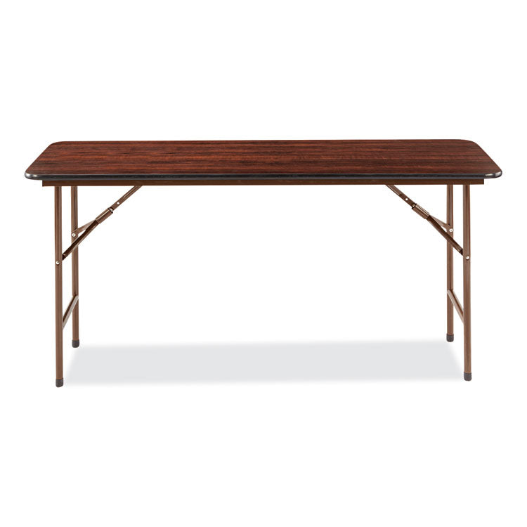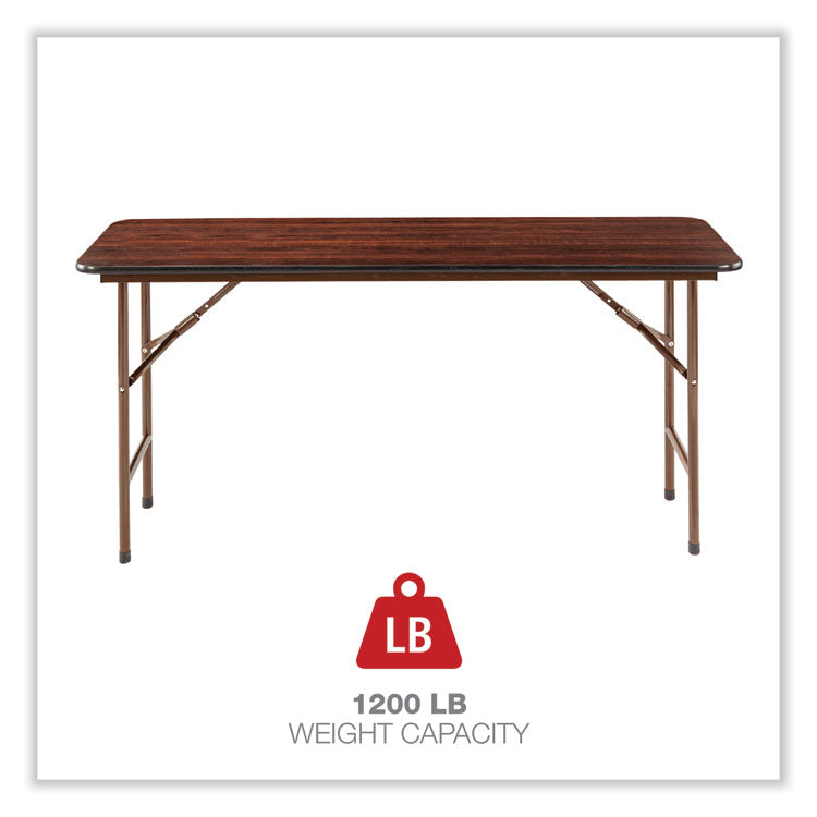 Folding table with scratch-resistant melamine top that is 0.63" thick with a one-piece, 1.75" steel apron and protective edging. Fully finished laminate on top and underside to prevent warping. Laminate is scratch, dent, and water-resistant for long-lasting use. The gravity leg-locking mechanism makes set-up quick and easy. Folds to 2.5" thick and locks for easy transport and storage. 1" diameter, steel legs have plastic foot caps to protect floors. Holds up to 1,200 lbs of evenly distributed weight. Top Color: Mahogany; Color Family: Mahogany; Top Shape: Rectangular; Top Thickness: 0.63".