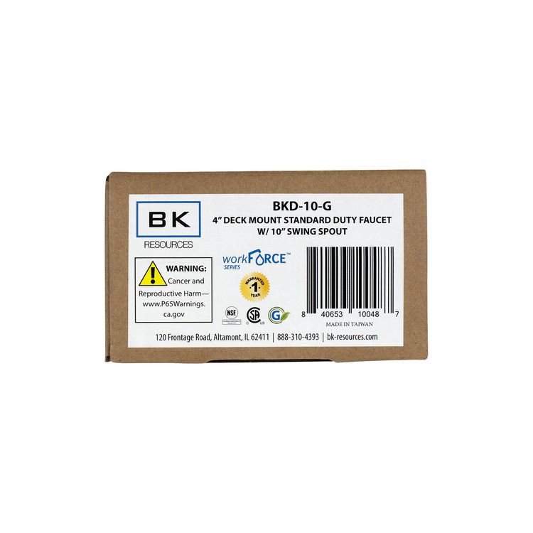 The Workforce Standard Duty Faucet with Spout and Mount is a reliable choice, featuring 1/4 turn ceramic cartridges for smooth and efficient operation. Notably, this faucet is lead-free, prioritizing safety. It complies with ANSI/NSF 61 and cCSAus standards, ensuring that it meets industry-approved quality and safety measures. With its combination of functionality and adherence to standards, this standard duty faucet is suitable for various applications where reliability and compliance are key considerations. Features: 4.55" Height/10" Reach; Color(s): Chrome-Plated Brass.