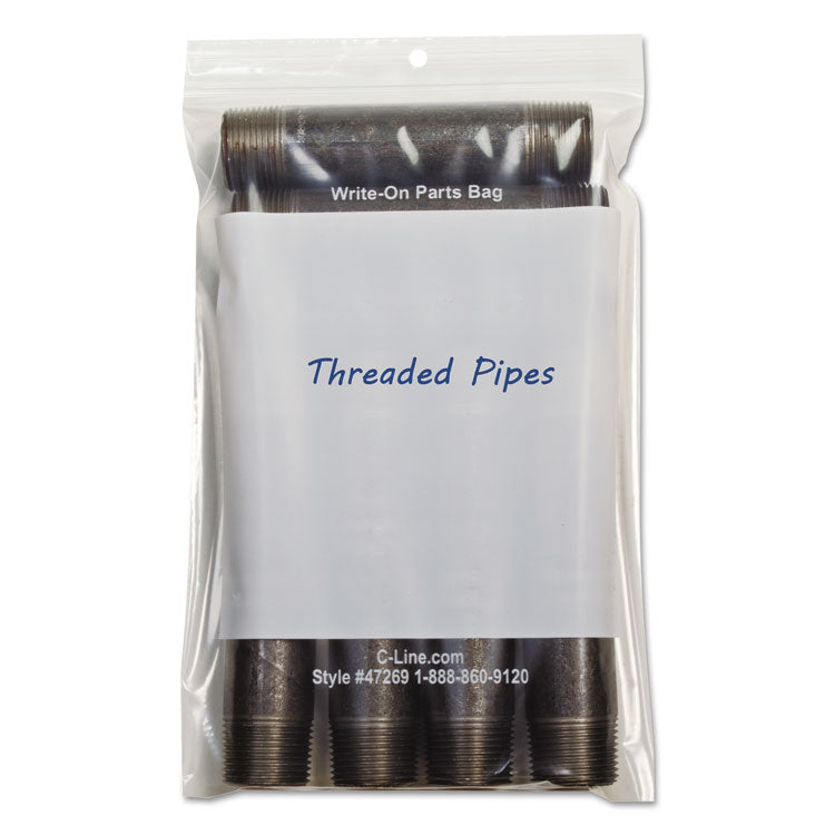 Perfect for storing items, such as rubber bands, screws, or push pins. Make identification of the contents easier by labeling the bags. The write-on panel, located on one side of the bag, works with both pen and marker. Clear, poly bags have a zip-close seal that makes them waterproof, airtight and reusable. This product will be cheerfully replaced with one of equal value if defective in materials, manufacturing or packaging at the time of purchase. Except for such replacement, this product is sold without warranty or liability even though defect, damage or loss is caused by negligence or other fault. Application: Storage; Thickness: 2 mil; Material(s): Polyethylene; Width: 6".