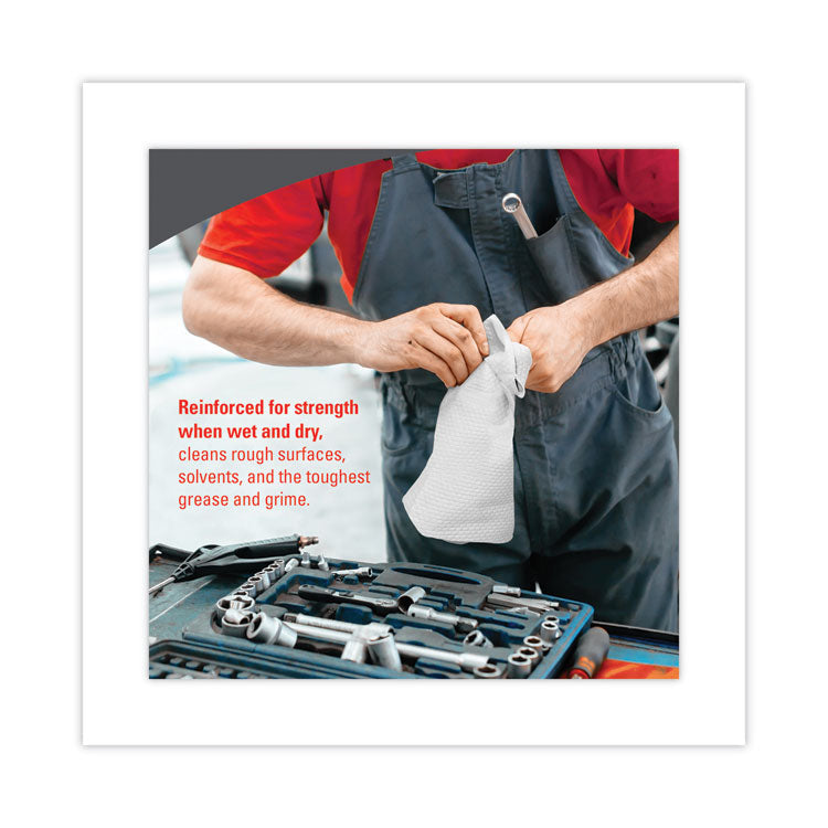 Regardless of your task, industry or budget, our WypAll® wipes, towels and cloths are designed to give you the durability, absorbency and versatility of a laundered cloth with the cost efficiency and hygiene of a disposable. Trust the WypAll* Brand, the one that sets the standard for excellence in wipers. WypAll Power Clean X80 Cloths feature innovations like high-tech HydroKnit fast-absorbing material and are durable for scrubbing. These contaminant-free commercial wipers are a favorite replacement for laundered shop towels, which can harbor dangerous chemicals, such as lead. WypAll* X80 Cloths are made of soft pulp fibers, bonded to a polypropylene base sheet for absorbency and durability, making them suitable for removing dirt, oil, grime and solvents in industrial and manufacturing businesses. The reusable cloths are reinforced for strength when wet and dry. Use them for heavy duty machine- and part-wiping, wiping metal shavings, prepping surfaces with solvents and cleaning rough surfaces. After all, every business gets dirty, but for the toughest grease and grime, you can trust WypAll* X80 Cloths. As we look towards the future, Kimberly-Clark Professional is committed to providing a wide collection of essential products and services that help make your workplace exceptional. Our dedication to innovation has helped businesses confidently navigate change and empowered people at work for nearly 150 years and we are committed to do so for years to come. Pop-Up* Box. Towel/Wipe Type: Dry Wipes; Application: Auto Care; Industrial; Material(s): Hydroknit; Color(s): White.