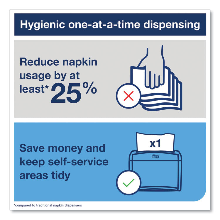 Impress your restaurant patrons with the exceptional quality of Tork Xpressnap Interfold Dispenser Napkins. Its one-at-a-time napkin dispensing design ensures that patrons use fewer napkins and touch only the napkin they use improving personnel hygiene. Plus, one-at-a-time dispensing helps decrease consumption, so you'll reduce the number of cases you need to store. Xpressnap napkins are larger than major competitor interfolded napkins offering strength, absorbency and quality to users. Universal. Material(s): Paper; Color(s): White; Width: 13"; Depth: 8.5".