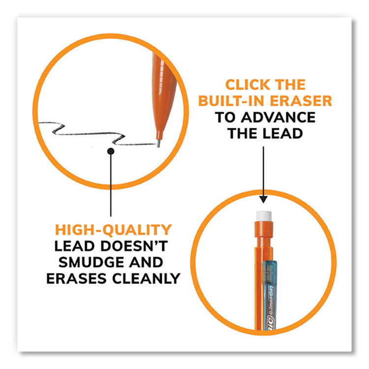 Experience smooth, dark writing with the BIC Xtra-Smooth Bright Edition No. 2 mechanical pencils with erasers. These 0.7 mm mechanical pencils have a medium point that's perfect for a variety of everyday writing activities. The high-quality lead doesn't smudge and erases cleanly, so your work looks professional and neat. Always ready, the BIC Xtra-Smooth Bright Edition No. 2 pencils are convenient, reliable, and never need sharpening—simply click the built-in eraser to advance the lead. They're the perfect mechanical pencils for school and come equipped with three pieces of No. 2 lead that's compatible with most standardized tests. With a colorful translucent barrel, these mechanical pencils have a sophisticated, modern look, and their colorful clips easily attach to pockets, notebooks, and more. Retractable: Yes; Eraser (Yes/No): Yes; Graphite Color(s): Black; Color Family: Black.