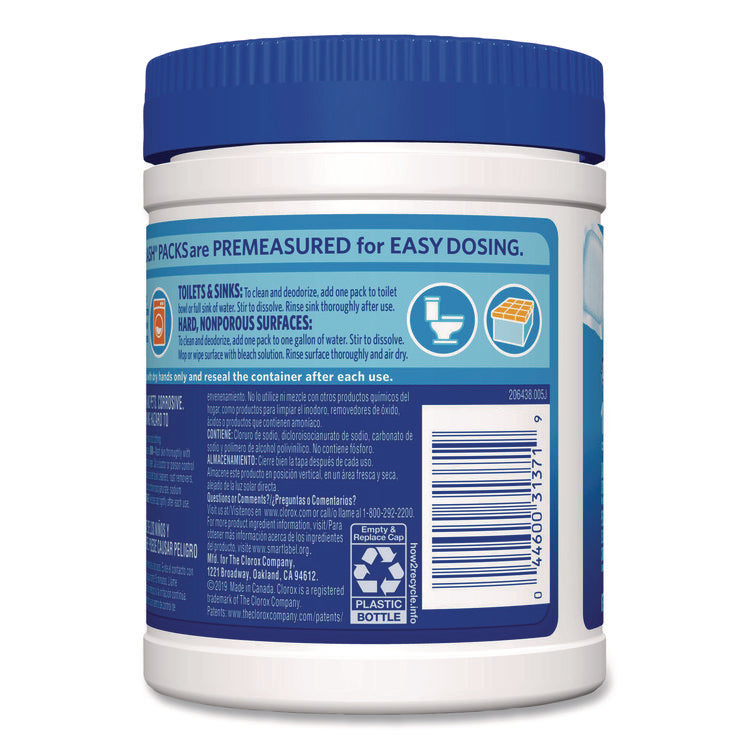 Clorox Zero Splash Bleach Packs bring you the Clorox Bleach clean in a convenient pre-measured solid pack for easy dosing. The solid bleach packs allow you to enjoy whiter laundry and cleaner surfaces without the splash and spills. Clorox Zero Splash Bleach Packs are a convenient solution for cleaning fabrics, toilets, sinks and hard, nonporous surfaces. These specially formulated packs activate upon contact with water for added control. Simply throw a Bleach Pack in the washer drum or drop a pack into a bucket, sink or toilet and stir to dissolve. The packs will dissolve fully in the wash. These compact bleach pods make it easy to grab a pack or two of these and go. No mess, just fresh clean clothes. Clorox Zero Splash Bleach Packs let you clean with the same trusted Clorox power without worrying about bleach spills, splatters or other laundry mishaps. Application: Bleaching; Applicable Material: Cement; Ceramics; Concrete; Enamel; Fabric; Glass; Laminate; Metal; Plastic; Chemical Compound: Sodium Dichloroisocyanurate; Dirt Types: Stains.