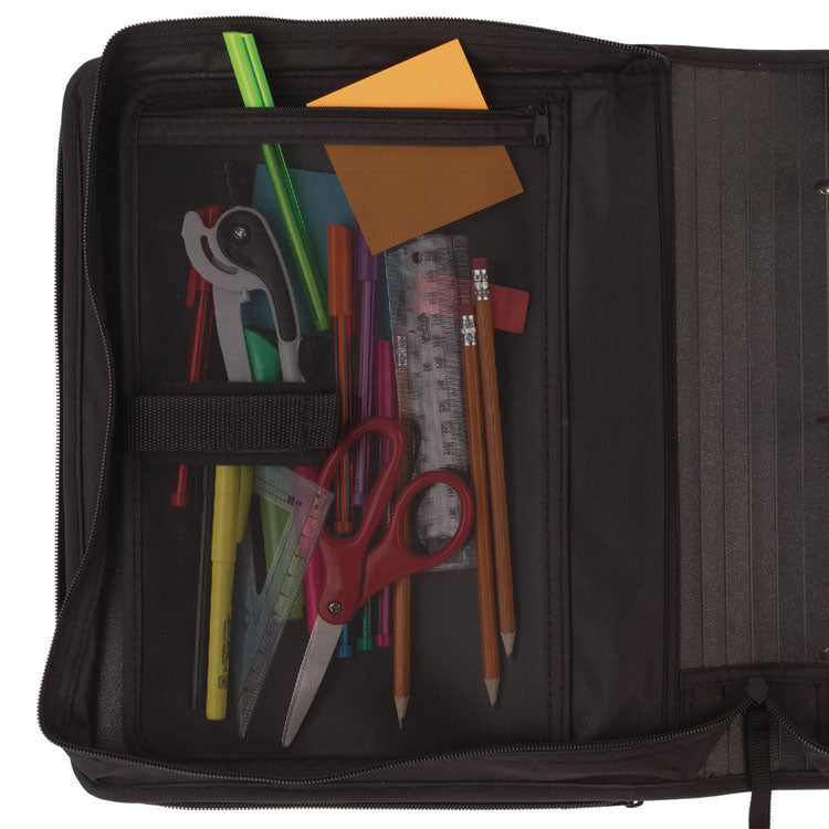Lasts all year! Guaranteed! A durable build and a water-resistant shell make it so. Between its rings and various storage options, this binder can keep that whole year together in one place, too. Interior zipper pocket keeps your school supplies secure. Zipper-closures, all around, ensure quick and easy access to all of your materials. Durable handle makes carrying it easy, but it slips into a book bag without a hitch, too. Zebra Print Design. Binder Type: Ring; Binder Style: Non-View; Binder Size Capacity: 2"; Binder Sheet Capacity: 530.
